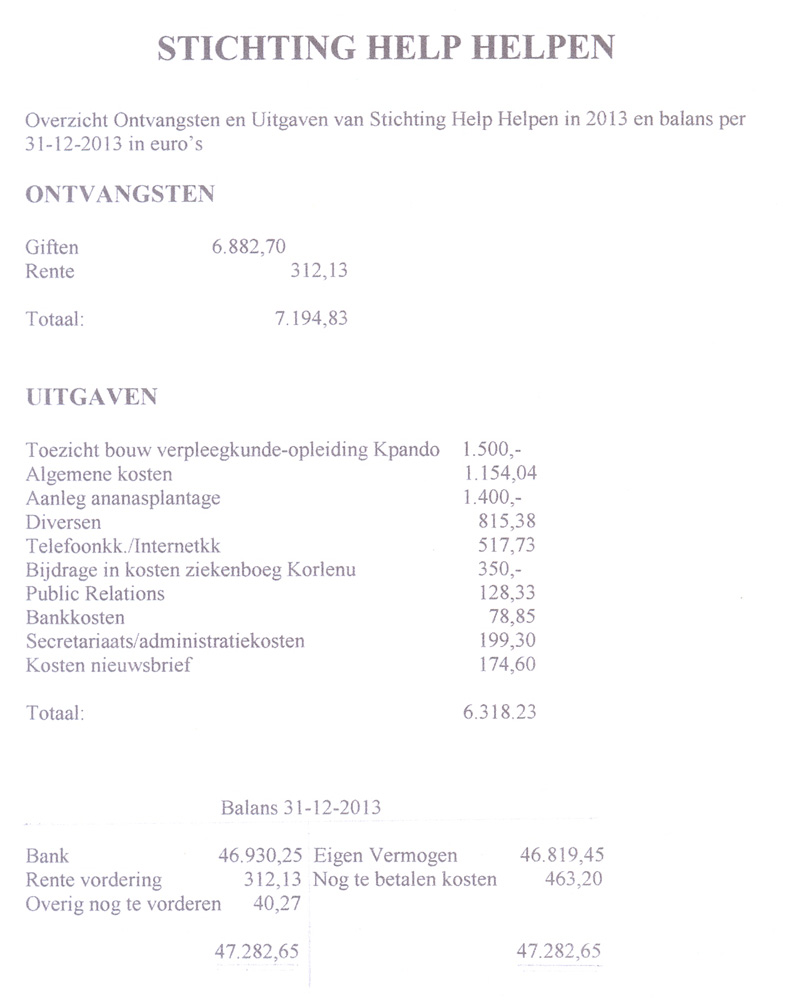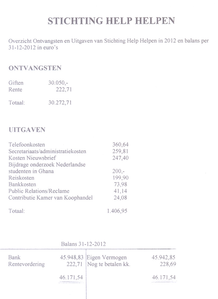 Jaarlijks maakt de Stichting Help Helpen een overzicht van de ontvangsten en uitgaven alsmede een balans.